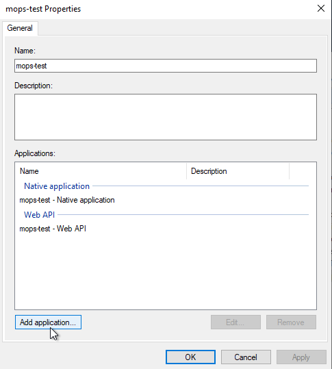 Application Groupsto the left and then selectmops-test. Click onAdd Application...