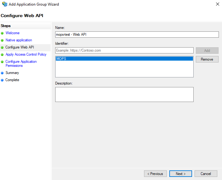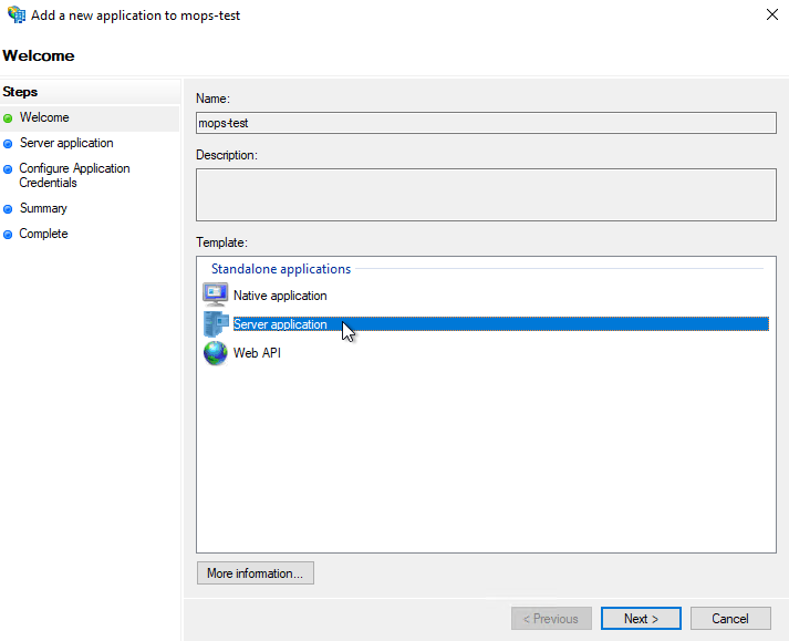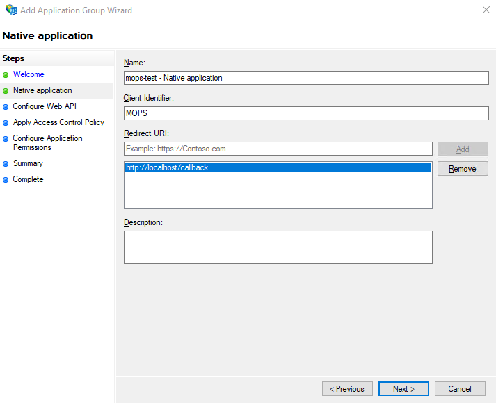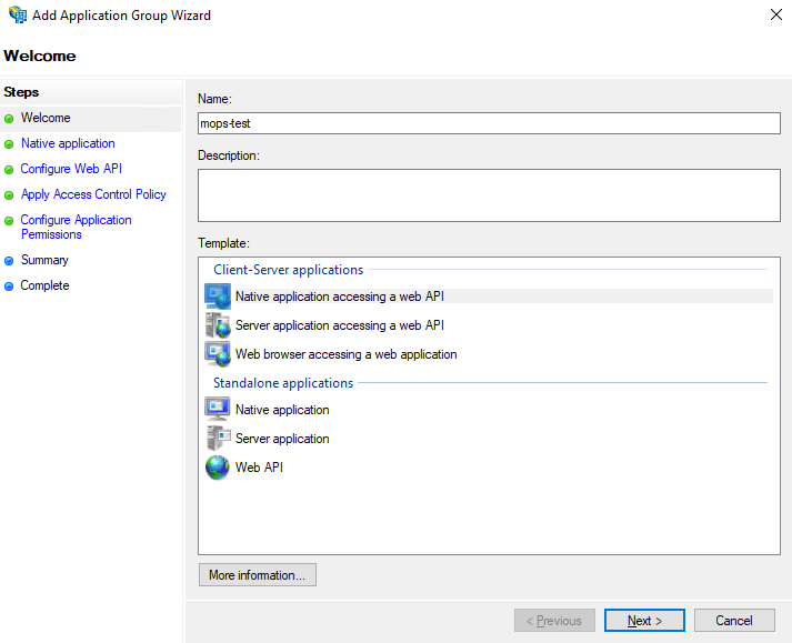 Add Application Group Wizardwill open, in theNamefield typeMOPS4.0and select the TemplateNative application accessing a web APImarked in the screenshot below. This will add steps in the menu to the left.