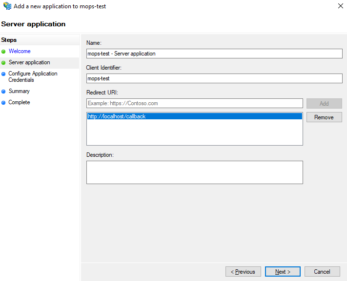 Native Application, Change the generatedClient IdentifiertoMOPSand add the following url:s by entering them inRedirect URIand clickingAdd: