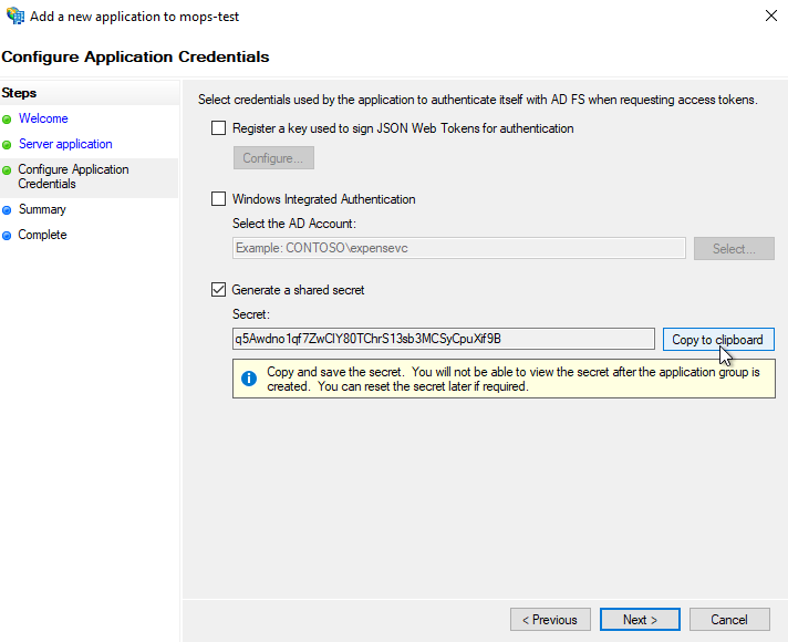 Generated a shared secretand click onCopy to clipboard. This value should be sent to the person configuring CMS for MOPS 4.0.