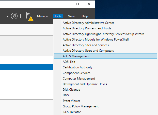 Server Manageron the computer that is runningAD FS, on the top-right menu chooseTools>AD FS Management.