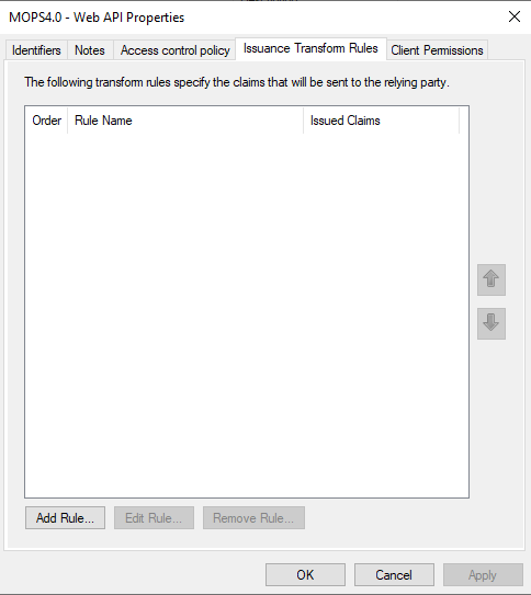 client_idclaim to use the value fromappid, clickApplication Groups>MOPS4.0>MOPS4.0 - Web API>Issuance Transform Rules, the window will look like this:
