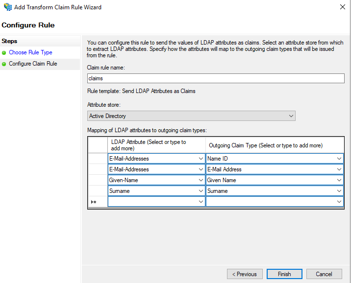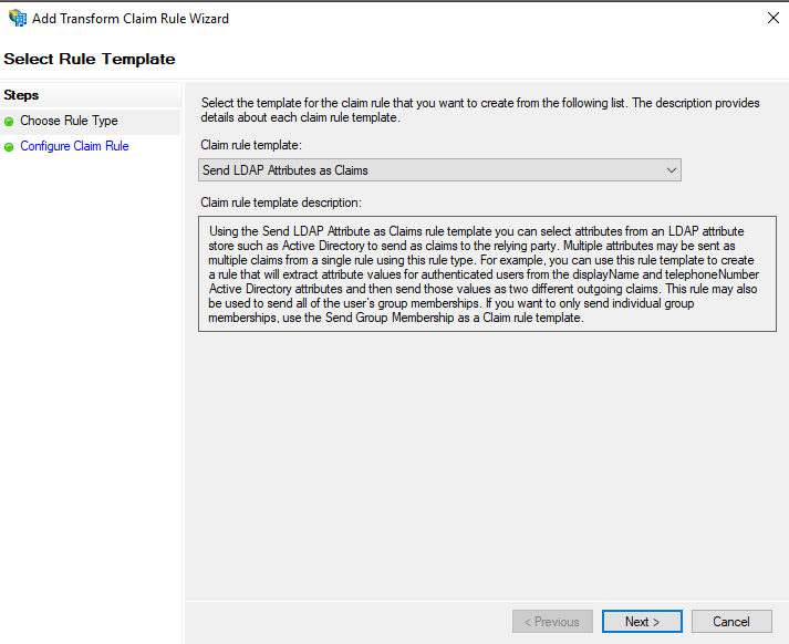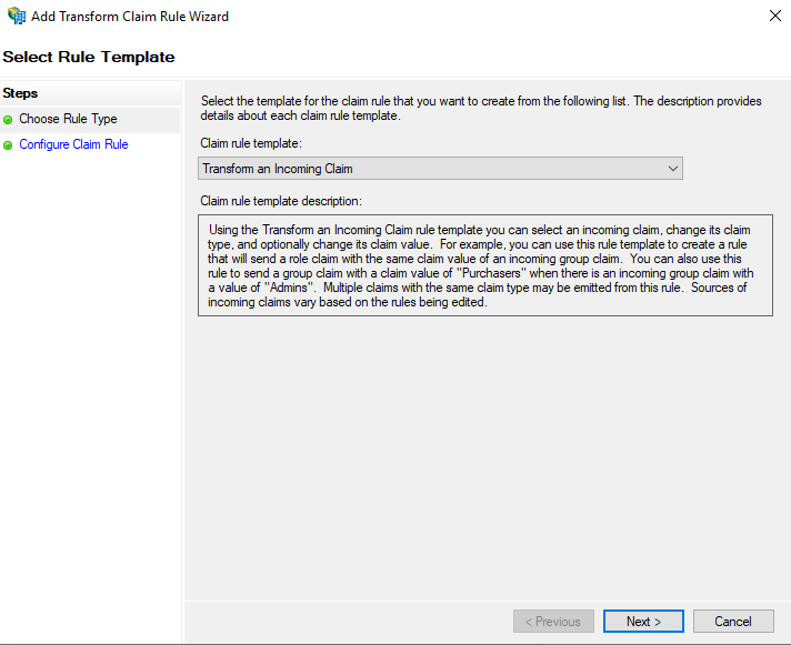 Add Rule. A new window will appear, select Claim rule templateTransform an Incoming Claim.