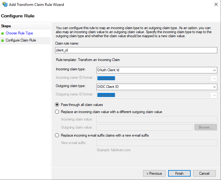 Oauth Client Id(appidclaim) to the newly createdOIDC Client ID(client_idclaim that will be shown in access tokens). Then selectPass through all claim valuesand click finish.