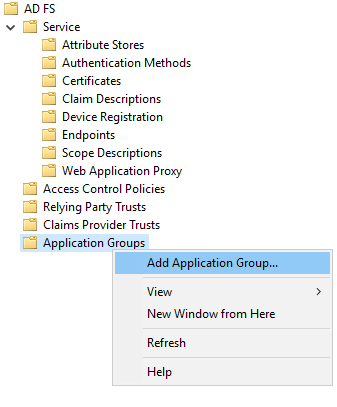 AD FS, in the menu to the left, right-click onApplication Groups>Add Application Group....