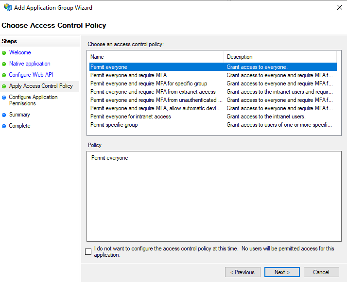 Access Control Policy-template, selectingPermit everyonewill allow everyone to access this Application Group.