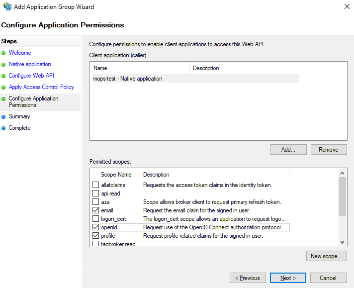 Configure Application Permissions,Client application-box should already containMOPS4.0 - Native application.