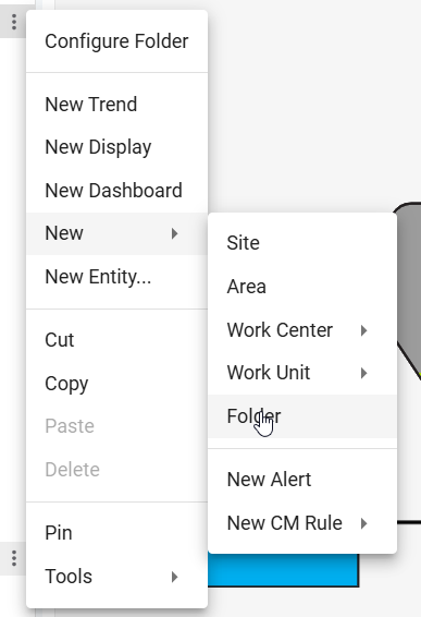 - New: The “New” command allows you to create a new item in the selected directory location. The type of item created can be selected from the submenu that appears when you click on the “New” command. The top part of this submenu contains common organization items and the bottom part presents Condition Monitoring System items.