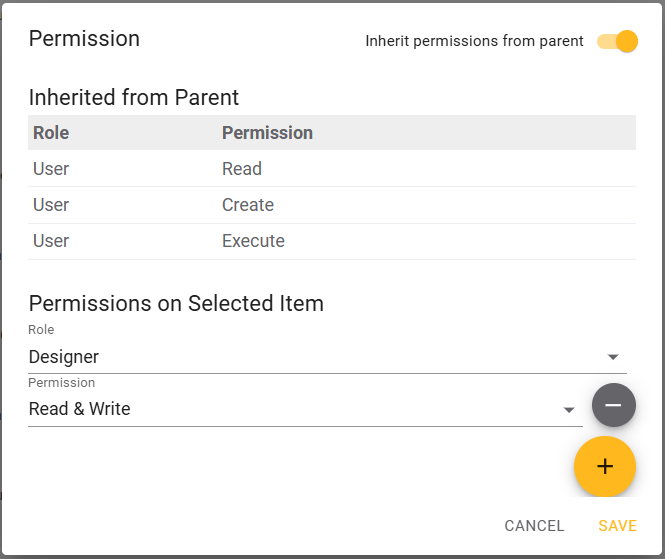 The top part of the modal show inherited permissions, while the bottom part shows the permissions that are set specifically for this entity. The inherited permissions are shown as read-only format and cannot be modified directly. If you want to change the inherited permissions, you need to modify the permissions at the parent level in the directory.